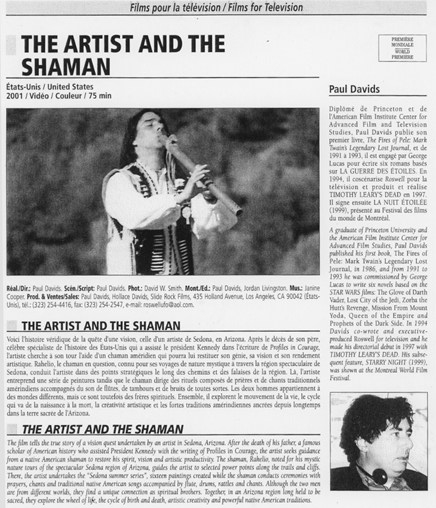 Following is the page about "The Artist and the Shaman" published in the book of entries of The Montreal World Film Festival 2001, and beneath it the text is transcribed. The book of entries included both a synopsis and a bio of Director Paul Davids (both in English and French). | |||||||||||