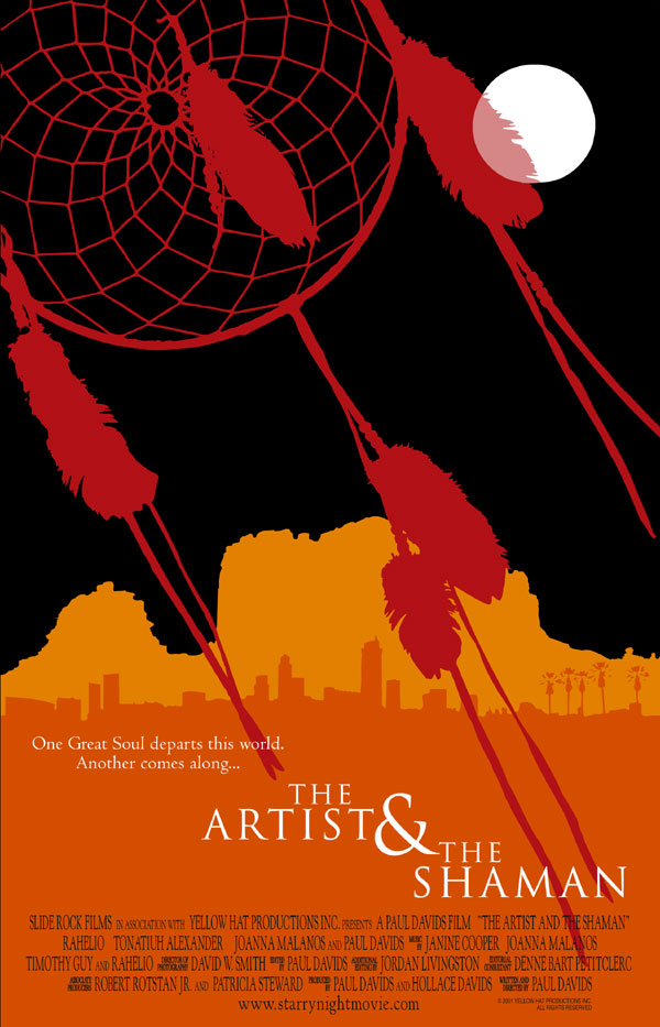 "THE ARTIST AND THE SHAMAN" A Paul Davids Film Running Time: 75 Minutes SYNOPSIS: "THE ARTIST AND THE SHAMAN" is the true story of a vision quest by an artist in Sedona, Arizona. After the death of his father, who was a famous scholar of American history who assisted JFK in the writing of the Pulitzer Prize-winning book, PROFILES IN COURAGE, the artist seeks guidance from a native American shaman to restore his spirit, vision and artistic productivity. The shaman, Rahelio, noted for his mystic nature tours of the spectacular Sedona region of Arizona, guides the artist to selected power points along the trails and cliffs. There, the artist undertakes the Sedona Summer Series - 16 paintings created while the shaman conducts ceremonies with prayers, chants and traditional native American songs using flute, drums, rattles and chants. The two men, from different worlds yet spiritual brothers as they travel Sedona's red rock trails, have a unique connection which they explore. The shaman and his wife were living in the artist's second home where the artist's father had spent some of his final days. Soon after the artist's father's death, they conceived a baby and the artist prayed for the rebirth of his father as the child of the shaman - hoping that reincarnation would be a means to keep his father's spirit in this world near him. When the artist comes for the vision quest as Rahelio and family are preparing to move out of his house, the little boy, Tonatiuh, is three years old. To the artist's astonishment, the small child already has a mastery of the knowledge of the 50 U.S. states, their names, shapes and locations. It's the first step a child would have to take to blossom in the direction of the expertise of the artist's father. Other connections are discovered as well. Is belief in reincarnation merely a psychological mechanism for coping with the loss of a loved one, or is there some real, tangible substance to it? Together, the artist and the shaman explore the wheel of life, the cycle of birth and death, artistic creativity, and powerful Native American traditions in an Arizona region long held to be sacred. Completion of the Sedona Summer Series leads to two art shows, one in Park City, Utah and another in Sedona, where the artist receives validation of the creative results of the vision quest. The artist in this story is Paul Davids, director of STARRY NIGHT, released by Universal Pictures (2001), as well as executive producer / co-writer of ROSWELL, the Golden Globe nominated Showtime film (for Best TV Motion Picture 1994) and the director of the controversial feature documentary TIMOTHY LEARY'S DEAD, which had a North American premiere at the Toronto Film Festival in 1997. His father was Professor Jules Davids of Georgetown University's School of Foreign Service, where he taught for 40 years with students who included Bill Clinton and Jackie Kennedy. Dr. Jules Davids is still regarded as one of the foremost authorities in his field, was a beloved teacher and author and editor of over 40 books. "THE ARTIST AND THE SHAMAN" is a production of Slide Rock Films (2001). APPEARING AS THEMSELVES: Rahelio, Paul Davids, Tonatiuh Alexander, Joanna Malanos PRODUCED BY Paul Davids and Hollace Davids WRITTEN AND DIRECTED BY Paul Davids DIRECTOR OF PHOTOGRAPHY David W. Smith ASSOCIATE PRODUCERS Robert Rotstan, Jr., Patricia Steward EDITED BY Paul Davids ADDITIONAL EDITING BY Jordan Livingston (who is also Assistant to the Director) ORIGINAL MUSIC BY Janine Cooper NATIVE AMERICAN CHANTS AND FOLKSONGS performed by Joanna Malanos FEATURING THE SONG "I SEE VISIONS" by Timothy Guy Filmed in Sedona, Arizona and Park City, Utah. Memorial Service for Dr. Jules Davids filmed at Georgetown University, Washington DC. Includes family archival footage of the Davids family filmed by Paul Davids in childhood ABOUT THE DIRECTOR: Paul Davids' feature directorial debut ("TIMOTHY LEARY'S DEAD")(1997) had its North American premiere at the Toronto Film Festival. His career includes: book author of six STAR WARS novels for Lucasfilm (written with his wife, Hollace Davids), production coordinator and writer of Hasbro's "THE TRANSFORMERS" TV series (animated) with involvement in about 90 half-hour episodes (1986-1987), segment producer of F. Lee Bailey's TV show "LIE DETECTOR." Other feature film credits: writer of "SHE DANCES ALONE" (1981) starring Bud Cort and Max von Sydow. Producer (with Hollace Davids) and writer/director of "STARRY NIGHT," released on video and DVD by Universal after winning audience award for Best Feature Film at the Newport Beach Film Festival (2000). Paul Davids is also an accomplished artist, having created about 100 oil paintings and hundreds of pen and ink drawings, many of which can be seen at the Paul Davids Online Art Gallery at this website. He earned a B.A. from Princeton University in Psychology and then studied under full scholarship at the American Film Institute Center for Advanced Film Studies. ABOUT THE PRODUCERS: Paul Davids' producing partner is Hollace Davids, who is Senior Vice-President of Special Projects of Universal Pictures, handling all major studio premieres, special projects and events. Hollace was an associate producer of "TIMOTHY LEARY'S DEAD" and a producer (with Paul) of "STARRY NIGHT." In 2000, she was selected California Mother of the Year by American Mothers, Inc. (Paul and Hollace have two children: Jordan, who is currently Art Director for The Ant Farm in Hollywood, and Scott Davids, a student at University of Colorado, Boulder). Hollace also is currently serving her second year as President of Women in Film, a prestigious Hollywood organization promoting the role of women in film and television. Women in Film sponsors the noted annual Crystal and Lucy Awards. She has worked in the motion picture business for over two decades, beginning at Los Angeles' film festival, FILMEX, and later becoming a publicist and Vice-President of first Columbia Pictures, then T