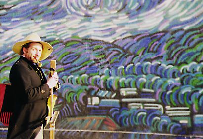 Abbott Alexander as Vincent van Gogh by mural of "Starry Night" |